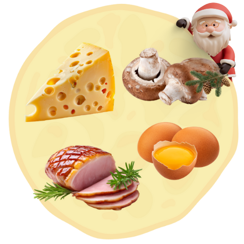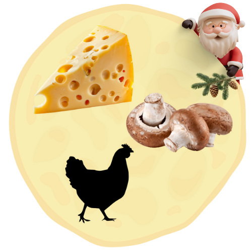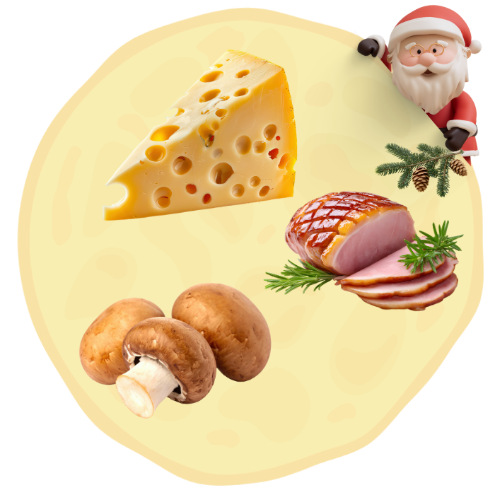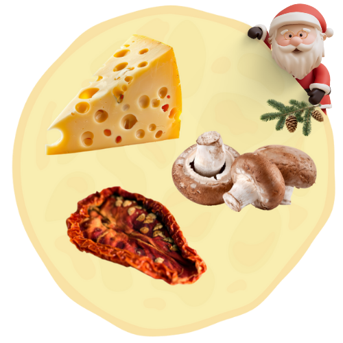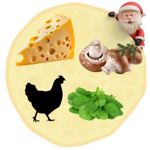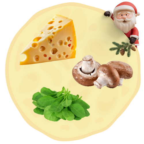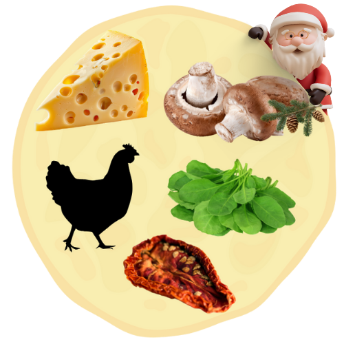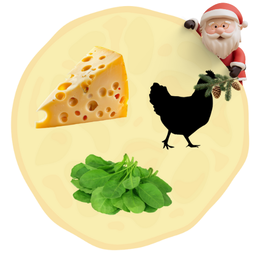 Naleśnik wytrawny z żółtym serem, pieczarkami, kurczakiem, szpinakiem i suszonymi pomidorami. Waga z nadzieniem, około 400g lub więcej. Średnica, około 40cm.