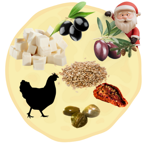 Naleśnik z serem FETA, kurczakiem, suszonymi pomidorami, oliwkami czarnymi, oliwkami kalamata, kaparami i prażonym słonecznikiem. Waga z nadzieniem, około 400g lub więcej. Średnica, około 40cm.