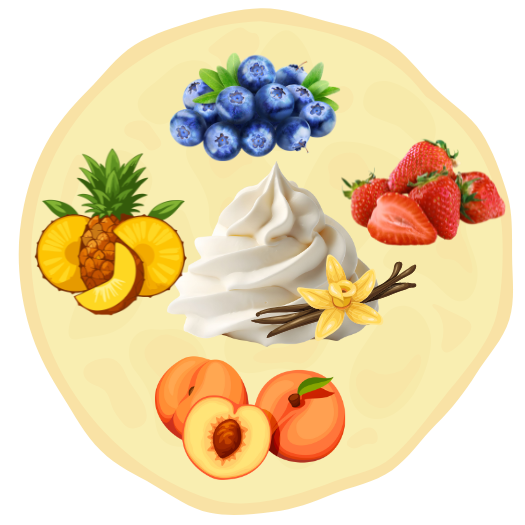 Naleśnik słodki z serkiem waniliowym i owocową mieszanką + dodatki według uznania. Waga z nadzieniem, około 300g lub więcej. Średnica, około 40cm.